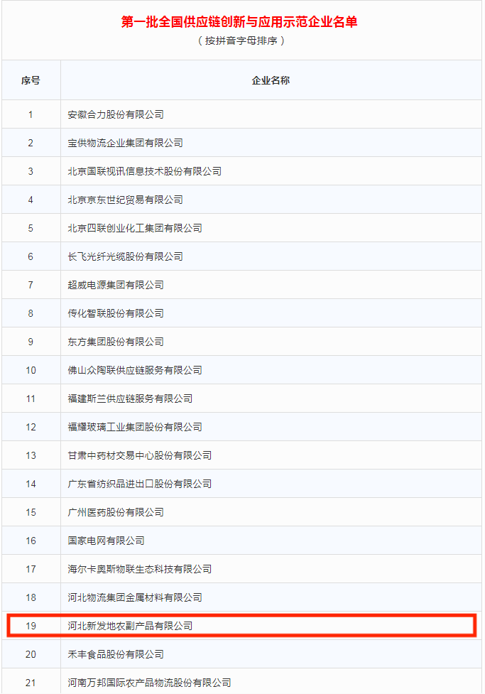 日前,國家商務部、工業(yè)和信息化部、生態(tài)環(huán)境部等8單位聯(lián)合印發(fā)通知,公布全國首批供應鏈創(chuàng)新與應用10個示范城市和94家示范企業(yè)。首衡集團憑借近年來在農產品供應鏈領域的創(chuàng)新成果,成功躋身首批全國供應鏈創(chuàng)新與應用示范企業(yè)。