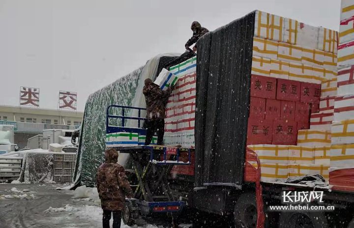 長城網·冀云客戶端11月7日訊(記者胡曉梅 通訊員吳青楊)11月7日,河北大部地區(qū)出現(xiàn)降雪天氣,首衡河北新發(fā)地市場上貨區(qū),滿載著貨品的物流車進進出出,商戶們依舊在風雪中裝車、分揀,全力保障“菜籃子”供應。