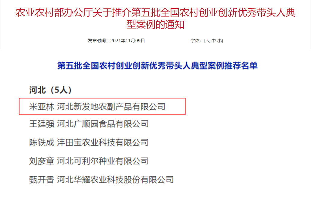11月9日,農業農村部印發《關于推介第五批全國農村創業創新優秀帶頭人典型案例的通知》,公布第五批全國農村創業創新優秀帶頭人。首衡河北新發地集團董事長米亞林成功當選。