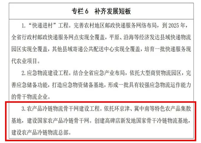 近日,河北省人民政府辦公廳發(fā)布《河北省建設(shè)全國現(xiàn)代商貿(mào)物流重要基地“十四五”規(guī)劃》(以下簡稱規(guī)劃)明確指出:為補(bǔ)齊發(fā)展短板,提升冷鏈物流服務(wù)品質(zhì),依托環(huán)京津,冀中南等特色農(nóng)產(chǎn)品集散基地,建設(shè)國家農(nóng)產(chǎn)品冷鏈骨干網(wǎng)。創(chuàng)建高碑店新發(fā)地(首衡智慧冷鏈)國家骨干冷鏈物流基地,建設(shè)農(nóng)產(chǎn)品冷鏈物流總部。該規(guī)劃作為河北省未來五年發(fā)展的中長期規(guī)劃,對于區(qū)域產(chǎn)業(yè)布局具有重要指導(dǎo)意義。