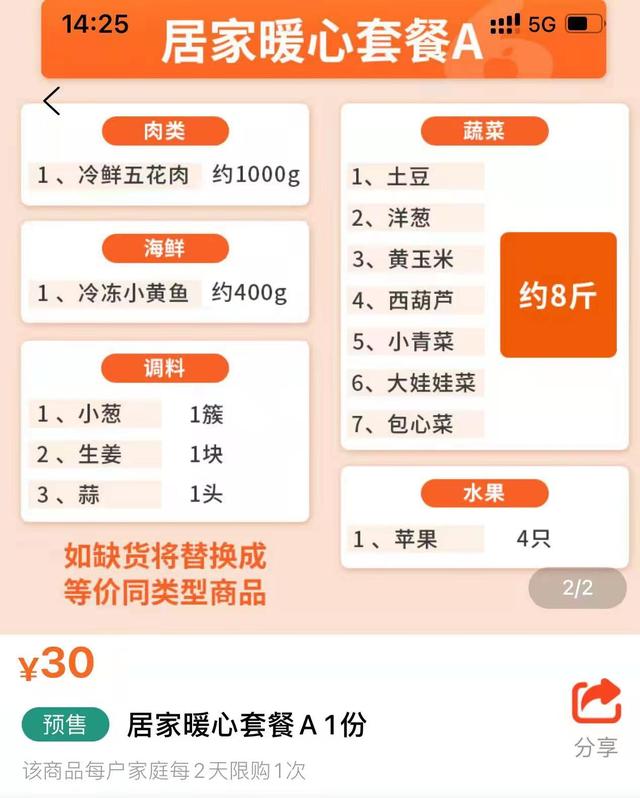 11日晚,該購物平臺“小6買菜”的負責人沈樂向新京報記者介紹,自本月1日當地新一輪疫情發生后,平臺第一時間與北侖區政府有關部門探討保障方案,次日便推出專供管控區及封控區居民的30元“居家暖心套餐”——每份商品成本約80元,政府補貼50元。