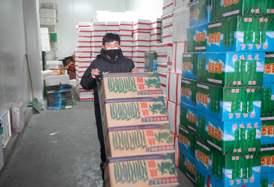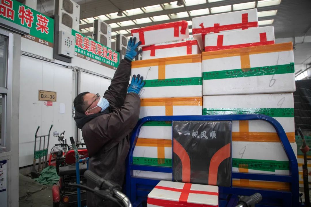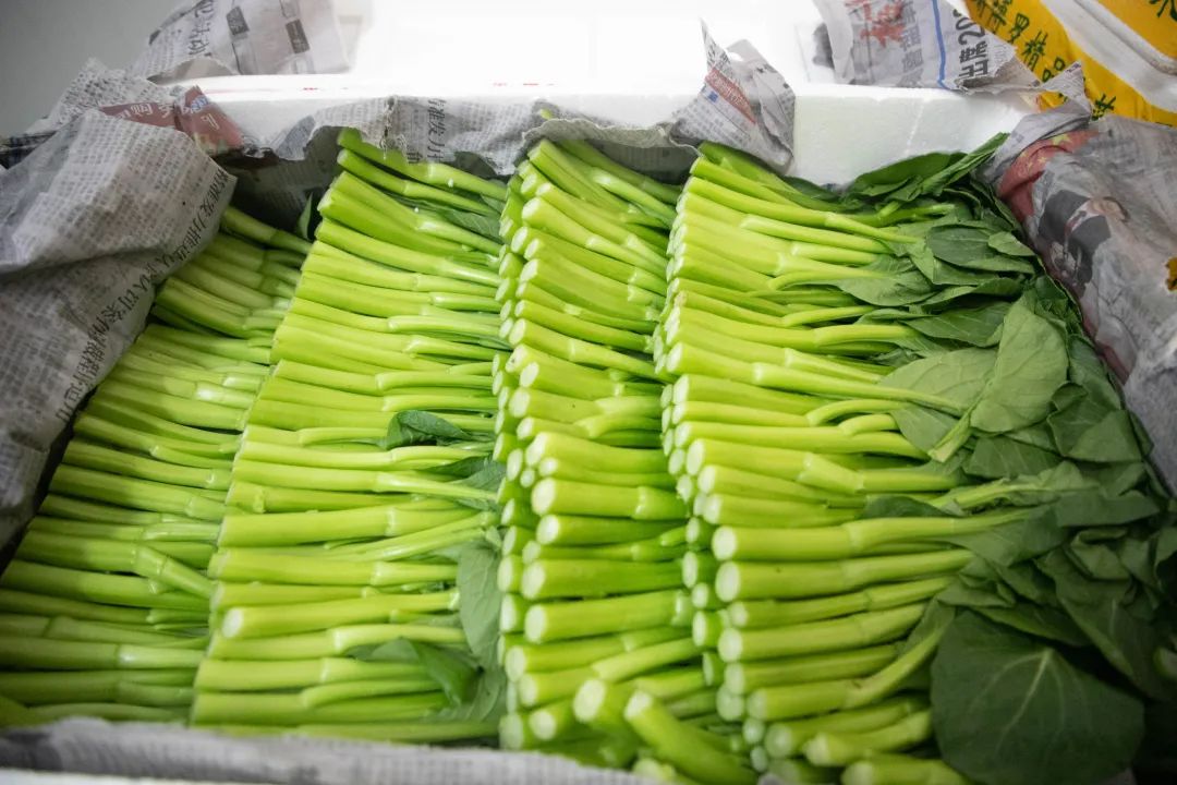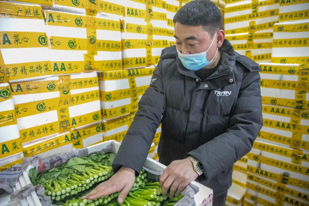 洪峰商貿的負責人李洪峰正在組織產品入庫,“這是剛才廣州產地運輸過來的菜心,最近像菜心、芥藍、香蔥等產品賣得比較好,每天銷售2000多件。”李洪峰介紹,“我們不能歇,像東三省、內蒙、山西等地下游客戶的訂單都排滿了,一直到年底了,我是吉林人,也不回老家了,就地過年保證供貨了。”