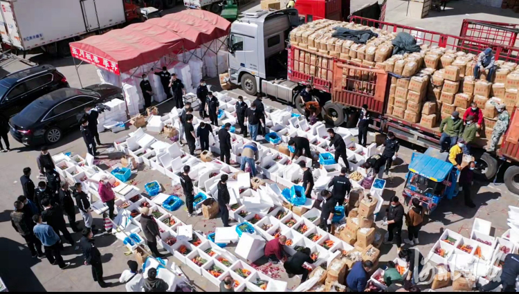 同時,在高碑店市有關部門的支持下,市場方面緊急聯系商戶,組織貨源,設置了6個上海保供物資分揀包裝區、36條分揀裝配線。4月1日13時物資陸續抵達加工區。高碑店市有關部門聯合首衡河北新發地員工和場內商戶共計1500余人,迅速投入工作中,徹夜不眠,按照標準工作流程和品質要求進行貨品的分揀、包裝、裝箱。當天22時,第一輛滿載著保障物資的物流車從市場駛出,運往高碑店鐵路貨運站。