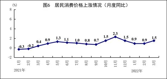 一季度,全國居民消費價格(CPI)同比上漲1.1%。其中,城市上漲1.2%,農村上漲0.7%。分類別看,食品煙酒價格同比下降1.3%,衣著價格上漲0.5%,居住價格上漲1.4%,生活用品及服務價格上漲0.6%,交通通信價格上漲5.5%,教育文化娛樂價格上漲2.6%,醫療保健價格上漲0.6%,其他用品及服務價格上漲0.7%。在食品煙酒價格中,糧食價格上漲1.7%,鮮果價格上漲6.9%,鮮菜價格上漲3.7%,豬肉價格下降41.8%。扣除食品和能源價格后的核心CPI同比上漲1.2%。3月份,全國居民消費價格同比上漲1.5%,漲幅比上月擴大0.6個百分點;環比持平。