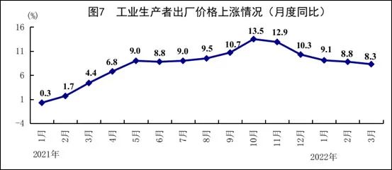 一季度,全國工業生產者出廠價格同比上漲8.7%。其中,3月份同比上漲8.3%,漲幅比上月回落0.5個百分點;環比上漲1.1%。一季度,工業生產者購進價格上漲11.3%。其中,3月份同比上漲10.7%,漲幅比上月回落0.5個百分點;環比上漲1.3%。