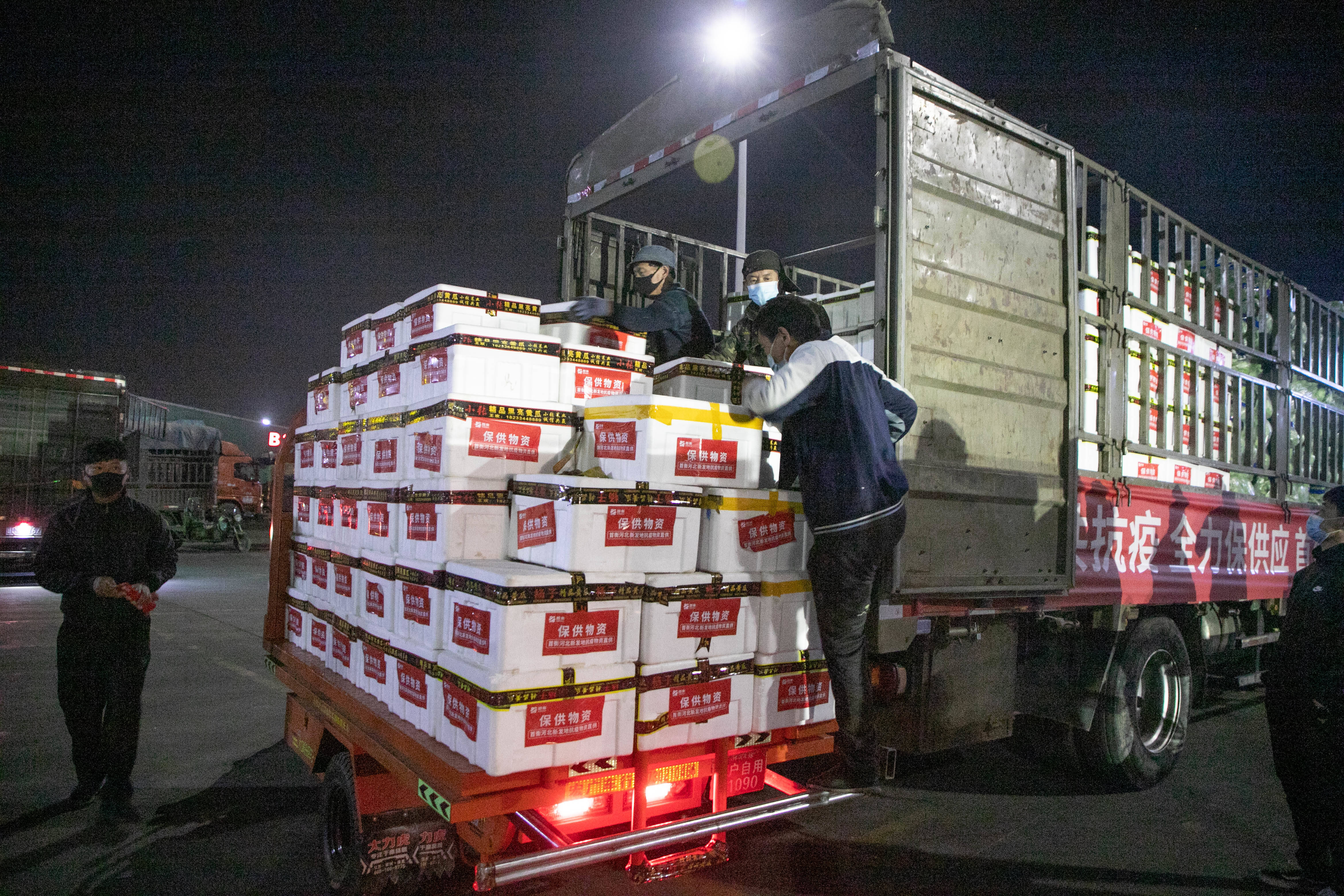 4月19日晚上,在高碑店的首衡河北新發(fā)地農(nóng)副產(chǎn)品物流園內(nèi),一批工作人員仍在忙碌。記者現(xiàn)場(chǎng)看到,短駁、裝卸工人正在緊張工作著,大家各司其職,現(xiàn)場(chǎng)有條不紊、井然有序,經(jīng)過(guò)緊張采買(mǎi)、搬運(yùn)、短駁運(yùn)輸、裝車(chē),一箱箱甘藍(lán)、胡蘿卜、西紅柿,一袋袋洋蔥、土豆……60噸蔬菜迅速集結(jié)到位,將分為兩批次運(yùn)抵安國(guó)。