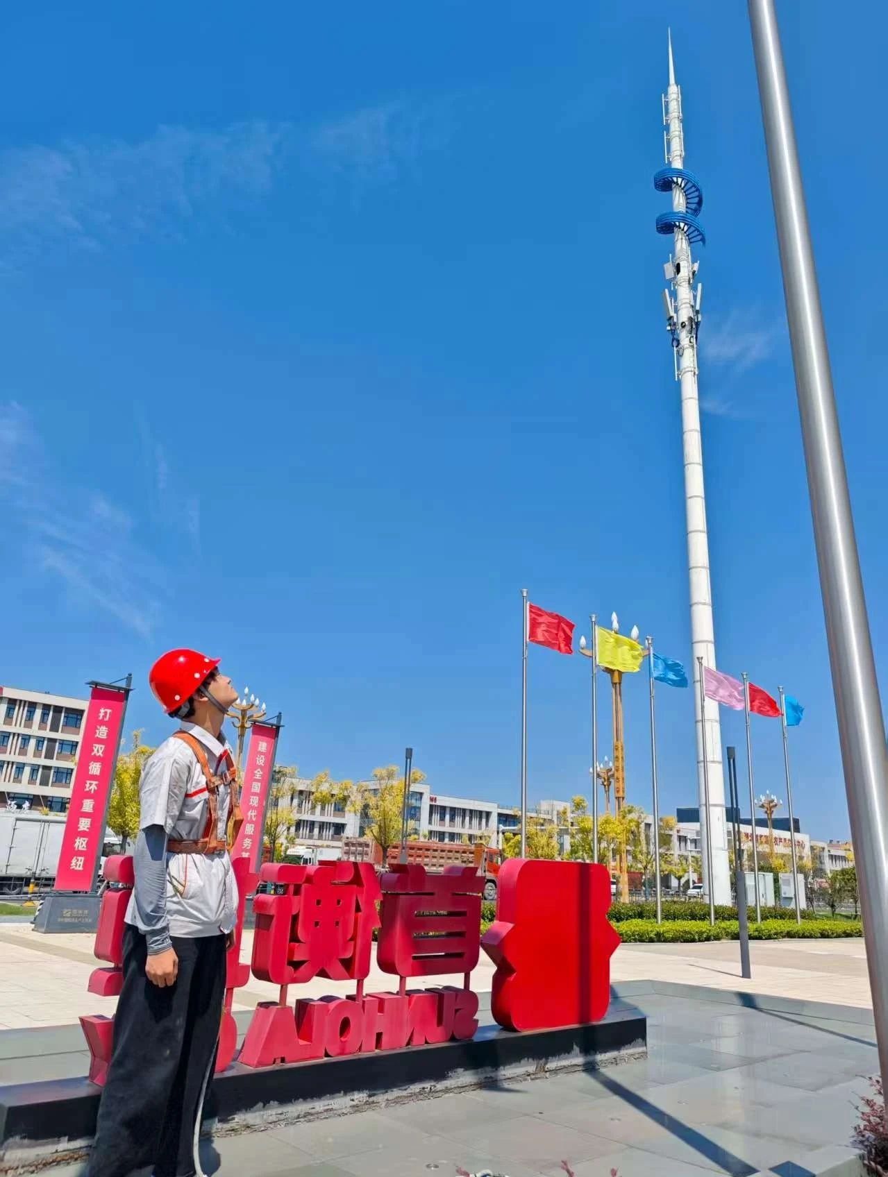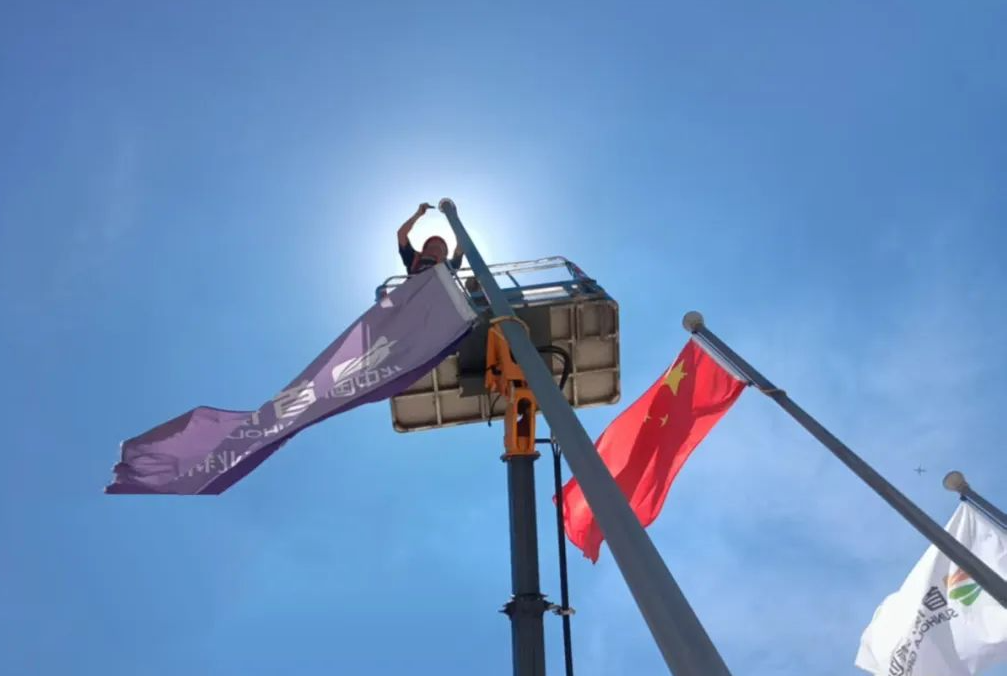 廣場上旗桿在正午的陽光下泛著白晃晃的刺目光澤,金屬表面溫度飆升。00后工程員丁欣的工作服被汗水反復浸透又曬干,緊緊繃在身上。他仰頭望向旗桿頂端時,汗水順著眉骨滑進眼睛,蜇的生疼,不得不瞇起眼睛,將安全繩又緊了緊。“卡扣松動,已加固!”此時頭頂的烈日毫無保留地傾瀉著光熱,丁欣翻開的維修記錄本,紙張正被高溫烘烤得微微卷曲,上面的字跡也被汗水暈染得不成樣子。