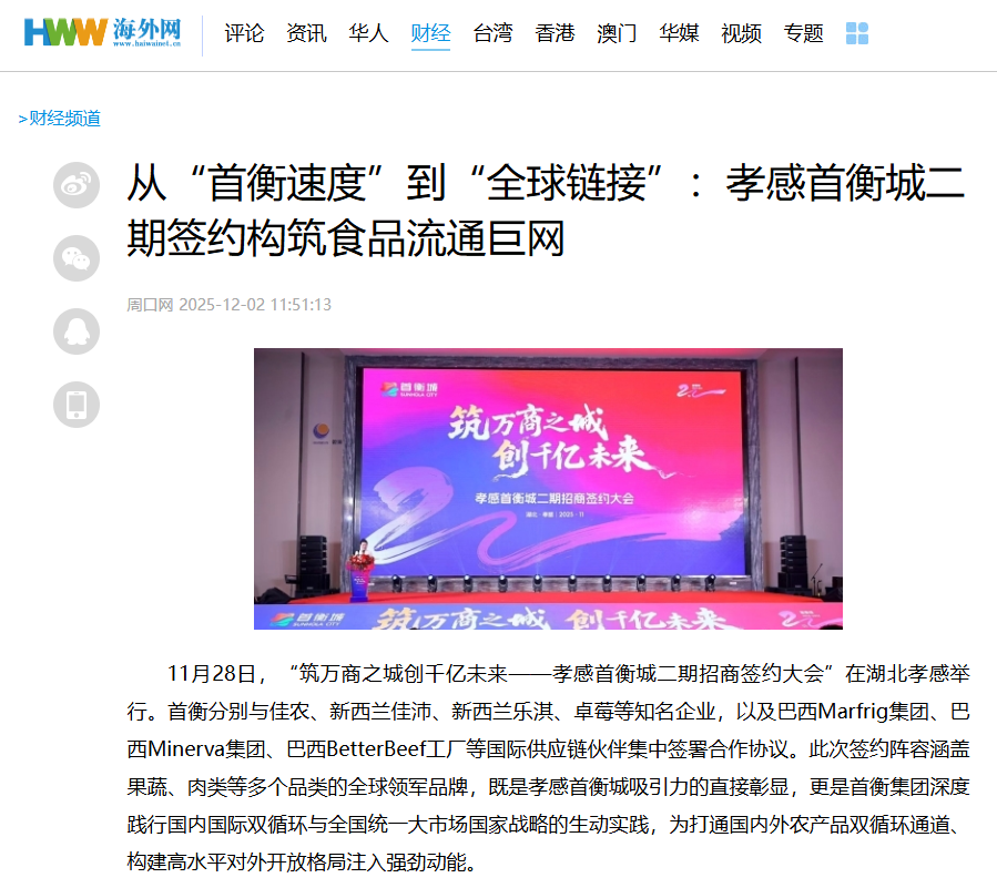 《人民日報》海外版,報道高度聚焦本次簽約的國際化陣容,稱之為“全球供應鏈天團”。文章詳細闡述了新西蘭佳沛、卓莓、巴西肉類巨頭等全球領軍品牌齊聚的意義,認為這是踐行國內國際雙循環戰略的生動實踐。