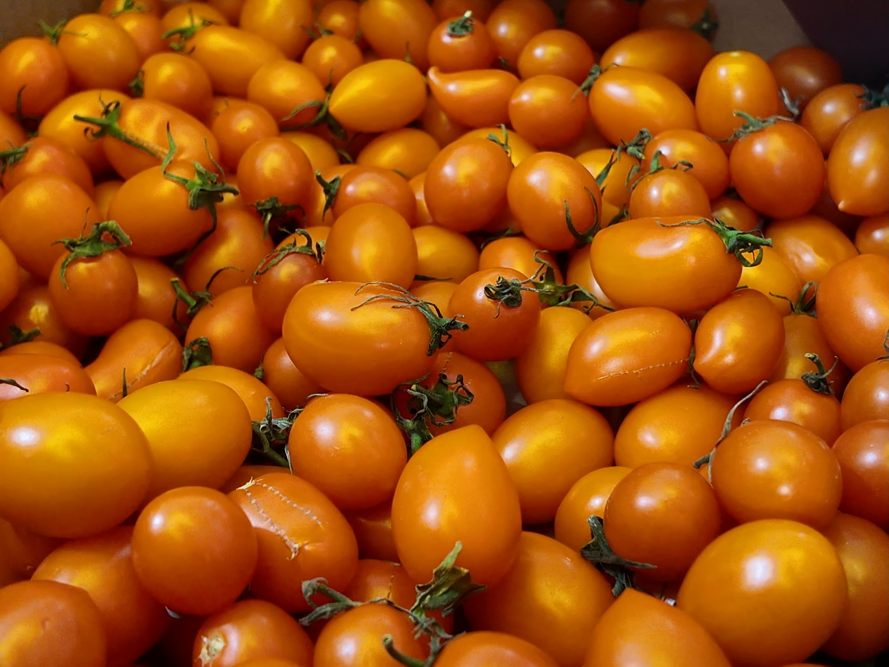黃色系小番茄堪稱名副其實的“甜蜜擔當”,甜度普遍高于紅色系,非常適合偏愛清甜口感的消費者。檔口主推迷戀系列與香芒皇后兩大品種:香芒皇后來自廣東,果實呈長橢圓形,單果重約15-20克,肉質軟糯,口感純甜且自帶特殊香氣,表皮韌性強、耐貯運,保鮮期遠超普通品種;迷戀系列主要產自山東,皮薄多汁、甘甜清爽,果味醇厚綿長。
