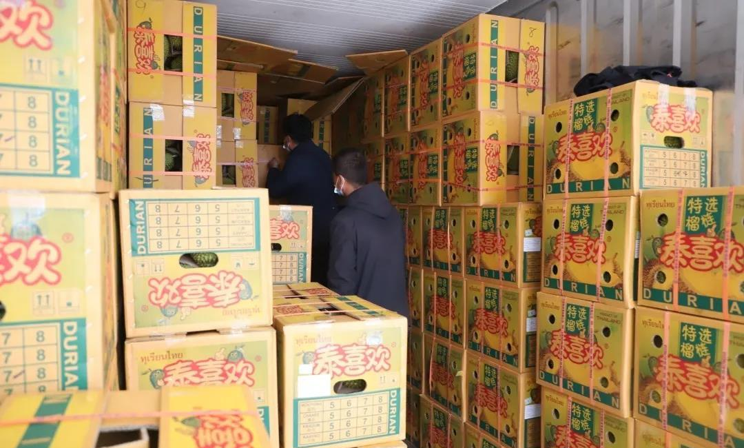 小編看到盛果源檔口前一直熙熙攘攘,采購客商不斷。尤其是在榴蓮車位前,前來拉貨的短駁車沒有斷過檔,剛滿車裝走,再來一車。工作人員也一直忙碌著洽談,裝卸。“我們這個季節的主打產品是泰國的榴蓮,我們是泰喜歡、金魚的河北代理。選擇入駐這里主要看中咱們市場客戶多、前景好。” 郭金彪介紹。“我們的這柜‘泰喜歡’早上開柜,到現在已經賣了快四百件了,走的相當不錯。”